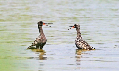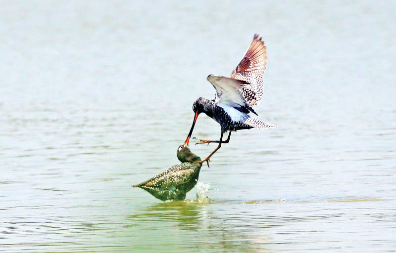 28日,在郊区湿地,一对鹤鹬为争夺领地从吵架到大打出手,十分有趣。