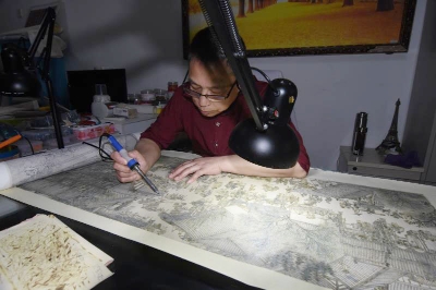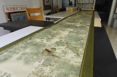 “以前没尝试过,火候很难掌握。”钱恩荣说,《清明上河图》巨幅临摹画不稀奇,单单是刺绣就有很多巨幅作品。他一直在练习烙画,即用火烧热烙铁在物体上熨出烙痕作画。他想烙出一幅《清明上河图》,先在油画布上将整幅的底稿画出来,然后用烙铁一点点地烙,烙画创作讲究火候和力度,一不小心就容易将画布烫坏,不得不从头再来。就这样,钱恩荣历时3个多月,每天耗时13个多小时,终于完成了长达8米多的《清明上河图》。