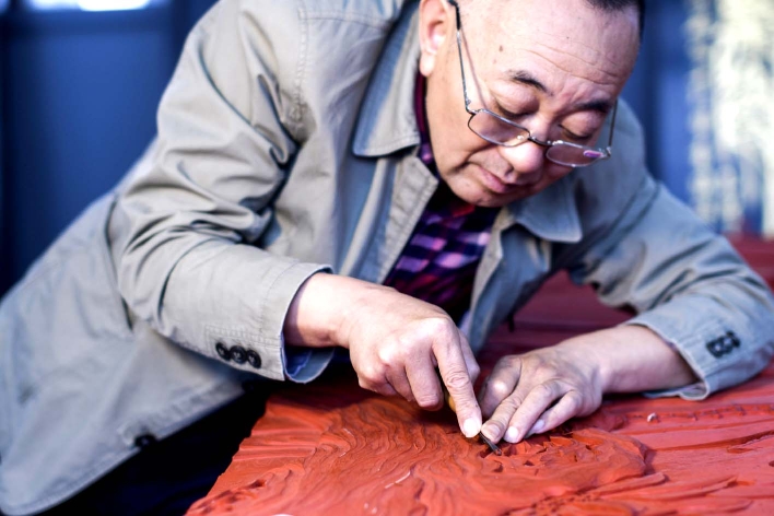 张来喜大师正在雕漆。 吴忠祥 摄
