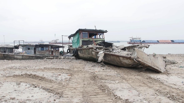 60多条渔船破拆需要场地,他们在距离渔船停靠点不远的地方,找一处空地,专门用来收纳渔船。渔船被拖到岸边后,再用挖掘机拖上岸,最后由专业队伍来破拆。昨天上午,已有20多条渔船被拖到渔船收纳点,这也是今年长江扬州岸线第一批上岸破拆的渔船。