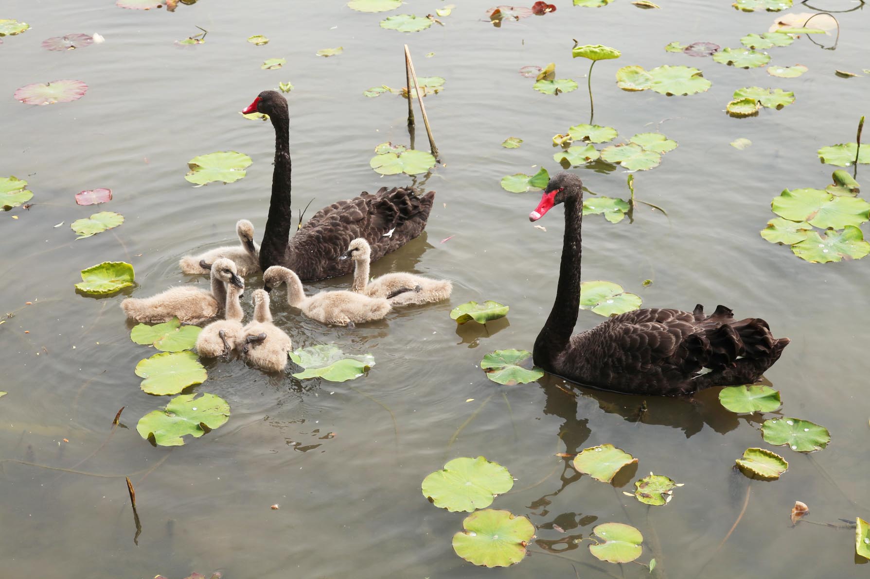 宋夹城东门水域,两只黑天鹅带着6只小天鹅在水面上悠闲地游弋。据说,两只大天鹅是从瘦西湖“私奔”过来的,它们选中宋夹城东护城河的一处河心岛筑巢孵蛋,6只天鹅宝宝正健康成长。 王乃驷 摄