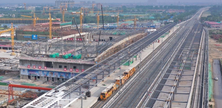 此外,站房旁的高铁站台上也正进行着钢结构施工,六条铁路线以及两个站台已完成建设。扬州高铁站车站规模为2台6线,站台长650米,预计6月底前站台施工全部完成。同时,紧邻站房的站前广场也在加紧建设。“站前广场占地面积约4万平方米,未来将设地下停车场和商务休闲区。”陈彦坤介绍,目前广场主体结构施工已完成80%,预计8月20日左右主体工程全部完成施工。