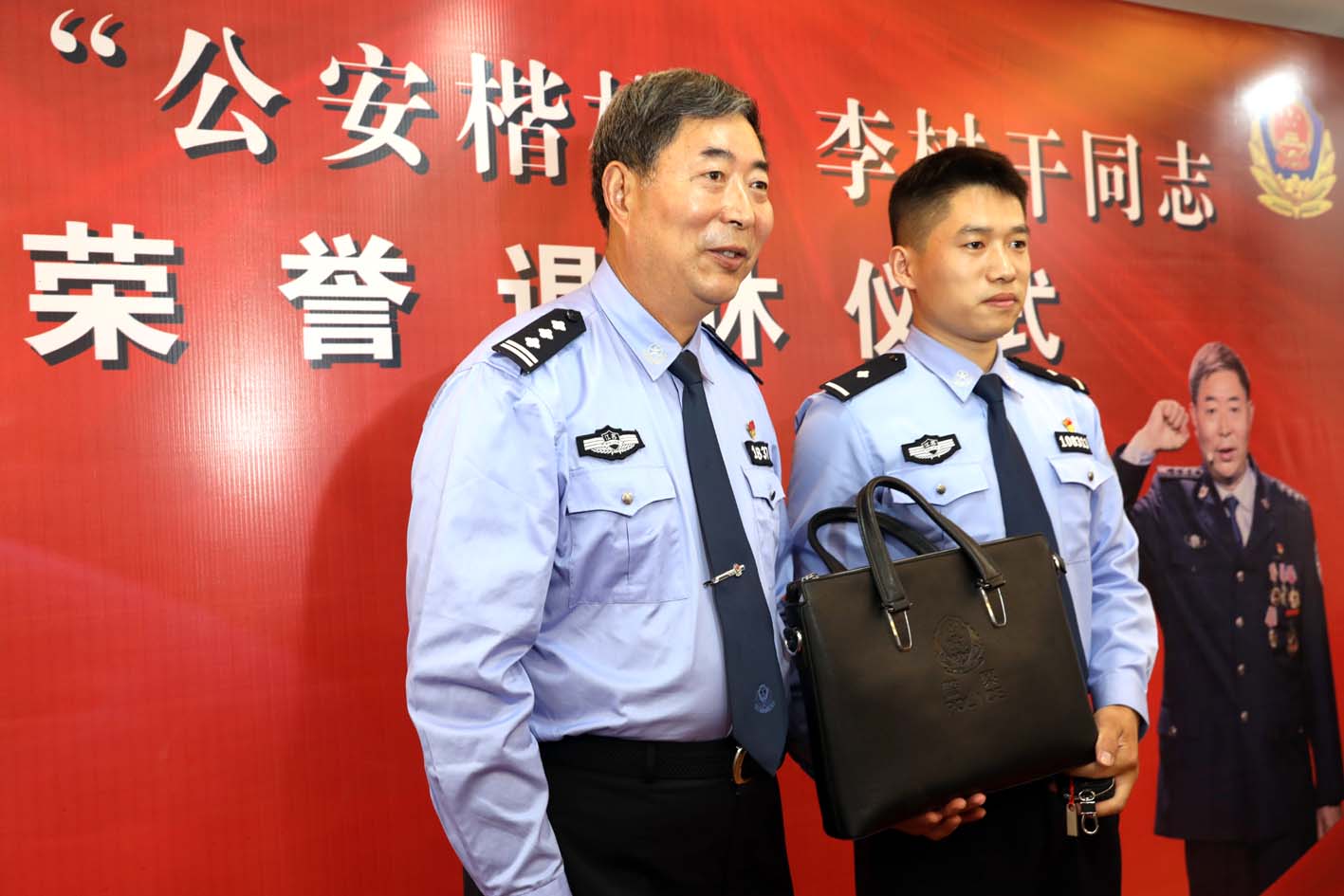受江苏省副省长、省公安厅厅长刘旸委托,省公安厅党委委员、政治部主任汤楠出席退休仪式,并以省公安厅党委名义,向李树干赠送民用摩托车。副市长、市公安局局长宫文飞出席活动,并为李树干颁发荣誉退休纪念章。