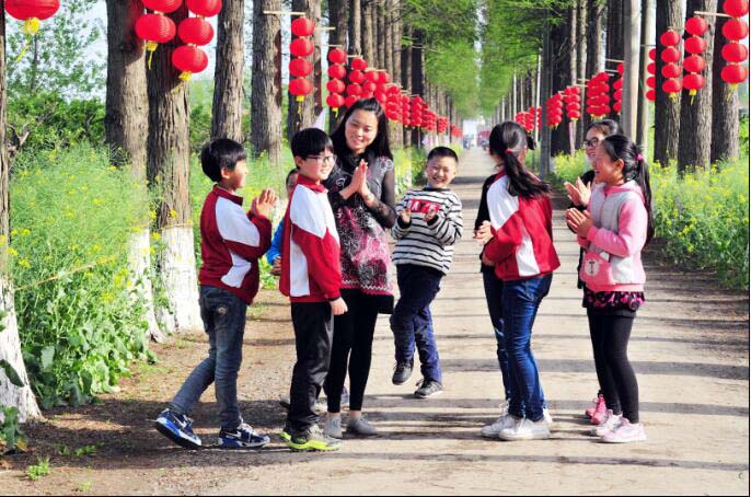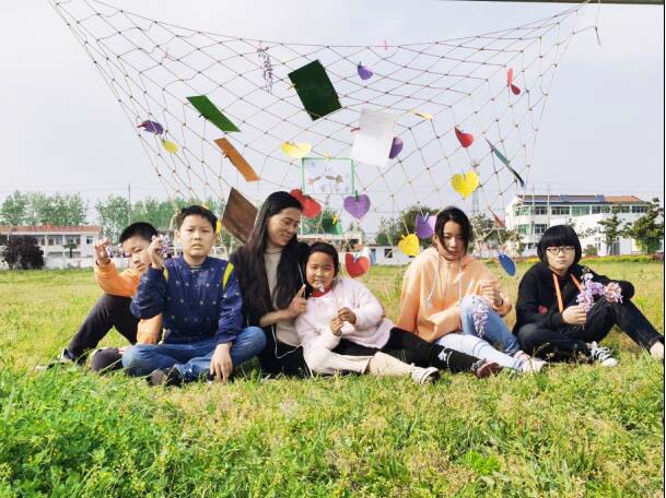 万绘和留守儿童们在一起。资料图片