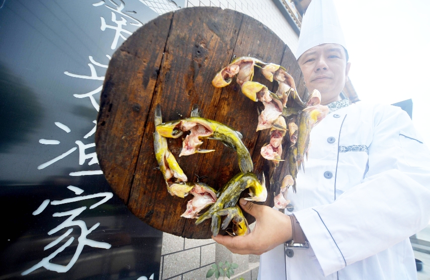 沈常来家中三代渔民,他打小就在邵伯湖边长大,几年前在沿湖村开了农家乐,做起了船家菜。沿湖村的船家菜有道招牌菜,叫锅盖鱼,是把昂刺鱼的大刺插到木质的锅盖上,锅里是调好的汤汁,汤汁的热气蒸熟了鱼肉,蒸制一定火候,骨肉分离,鱼肉掉入汤内。