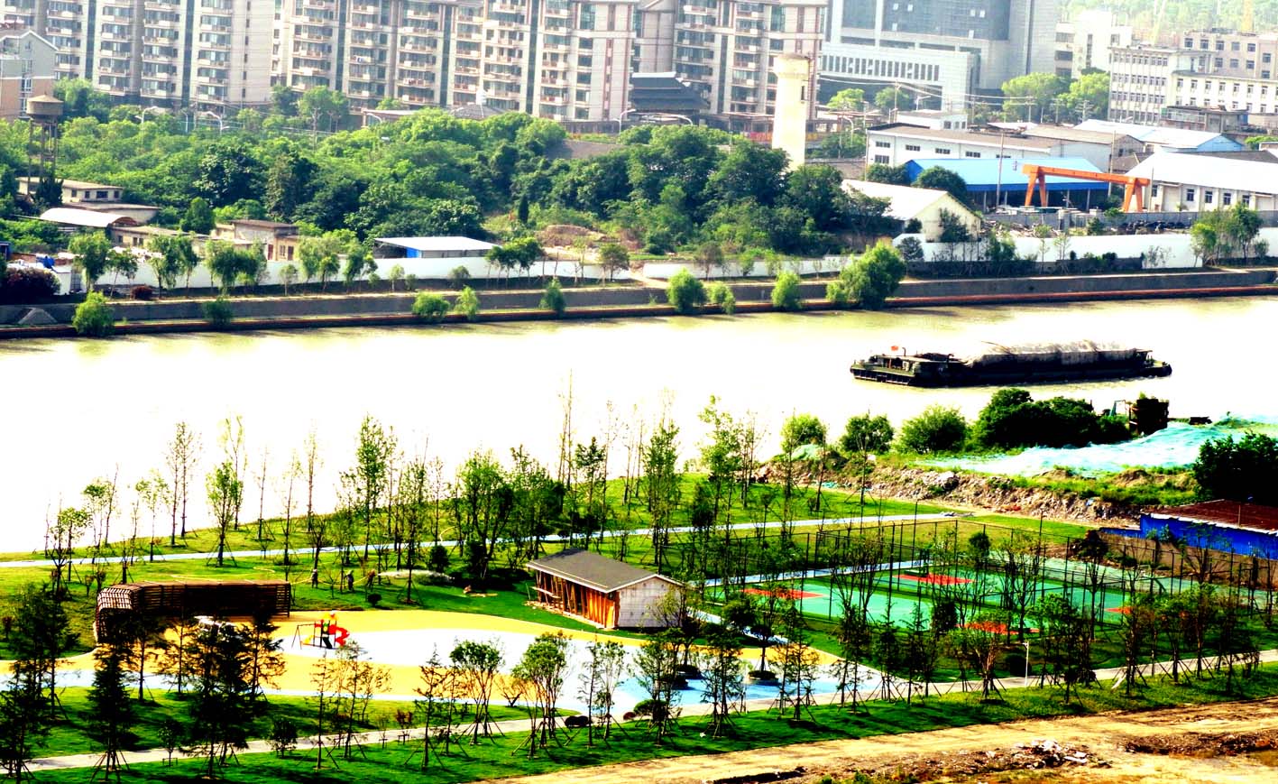 扬州网讯 (记者 张孔生) 京杭大运河扬州大桥段,曾是扬州的工厂密集区。这里原先机器轰鸣,烟囱林立。扬州大桥北侧原先有扬州钢铁厂、水利机械厂等企业。而大桥南侧,原先有公路管理处、阀门厂、磷肥厂等企业单位,同时还有众多单位的职工宿舍及砂石码头等。记者昨在大桥南侧的老磷肥厂地块看到,原先的磷肥厂地块等旧貌换新颜,原有的房屋、作业场地等建筑物已被拆除,取而代之的是绿树、鲜花和草坪,原先破旧的厂区“长”出了靓丽公园。