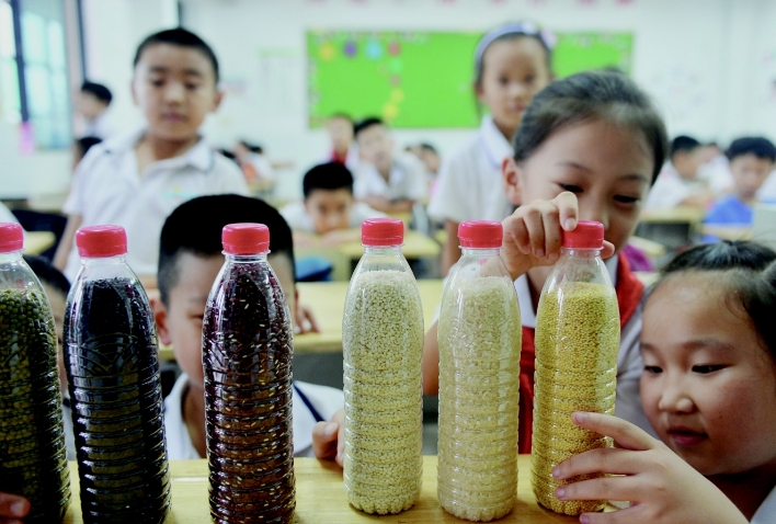 志愿者教小学生认识粮食。司新利 徐毅 摄