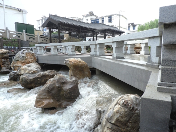 在北水关桥南侧西岸,一座凉亭已经建成,与东岸的长廊隔河相望,呈现“东廊西亭”景观。西岸的凉亭为四方亭,飞檐翘角,亭子为单檐,人字顶灰色小瓦,花格挂落,古色古香,亭子的柱子和梁上刷着暗红的国漆,古朴典雅。东岸的廊在亭子的东南侧,与亭子形成了一个斜线。景观游廊沿着河边南北向分布展开,南高北低,高低起伏,屋顶上铺设着整齐的青瓦,古典而具有韵味,景观廊下面同样安装着花格挂落,同时还有花格栏杆,展现古风古韵的中国风韵。从空中看,整个景观廊就像一段龙的脊背。