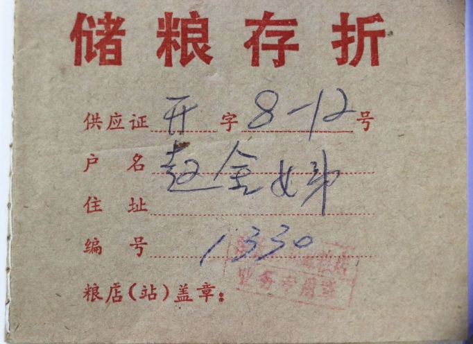 记者看到,这本“储粮存折”上的户名叫赵金娣,“储粮”时间是“(19)78年”,储存的粮食是大米,上面还盖有粮店的章。