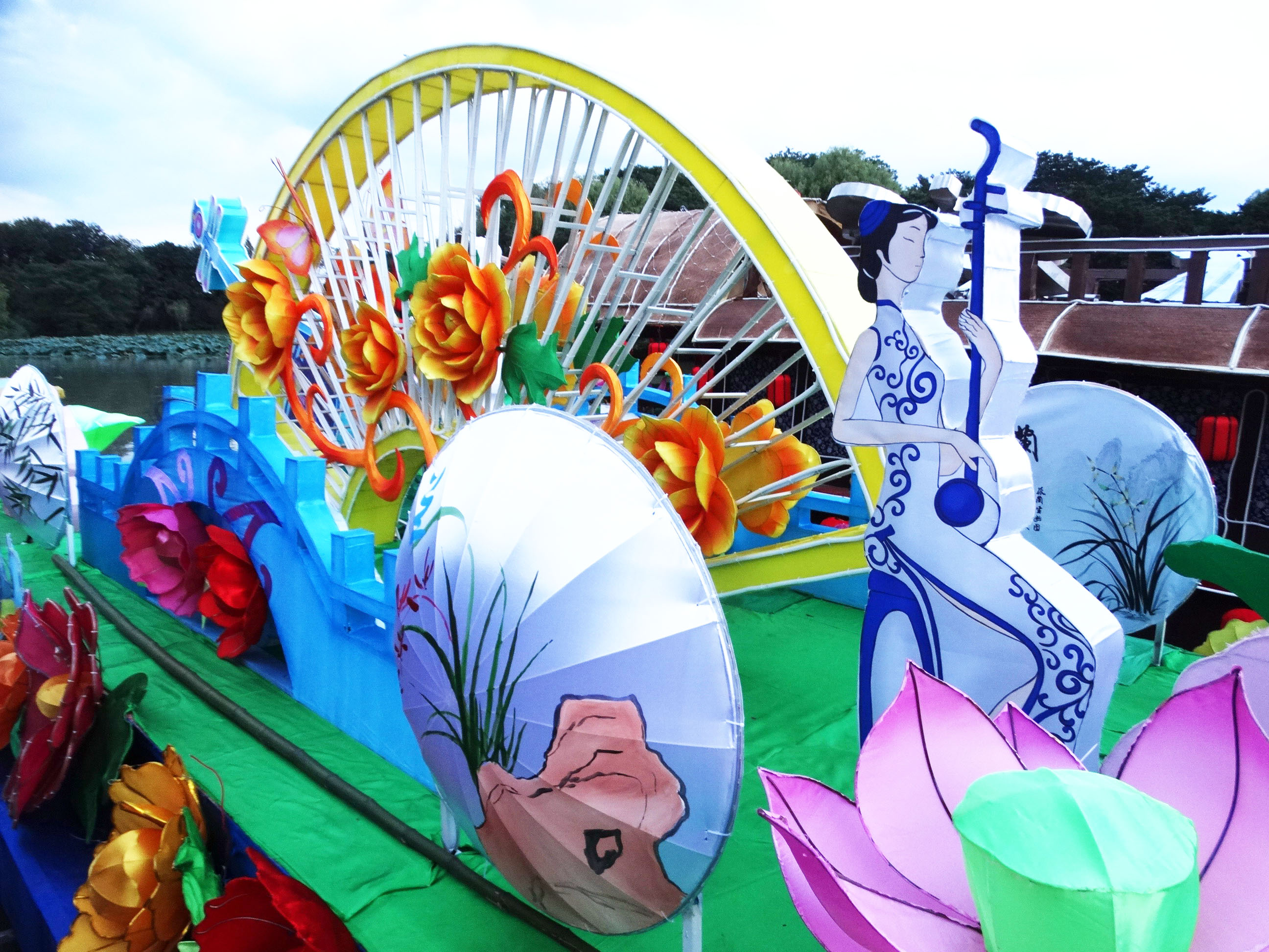 在现场记者看到,工作人员正在为一艘以乐器和鲜花为主要表现内容的花船进行通电调试,花船的船头是荷花,立着一名弹奏琵琶的美女;花船的两侧,是一把把彩色伞面,上面画有梅兰竹菊,船的前部立着一个四方亭,同时有弹奏月琴和拉着二胡的美女正在进行演奏;花船的中部,是一个巨大的半圆形花屏,上面盛开着一朵朵鲜花,船尾则有着一把巨大的琵琶……整体看来,这艘花船充满浓浓的文化内涵,十分优美。