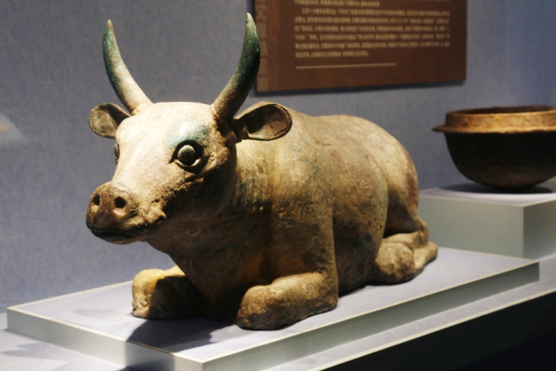 本次展览迎来了宁夏博物馆“国宝级”文物,也是宁夏博物馆的镇馆之宝——鎏金铜牛,这头铜牛造型和扬州邵伯斗野亭内的大铁牛十分相似,整尊铜牛呈跪卧姿,双角弯曲,双耳椭圆直立,眼睛圆睁而且外突,似在注视远方,炯炯有神,鼻子微微上翘,颈部肌肉线条非常清晰。