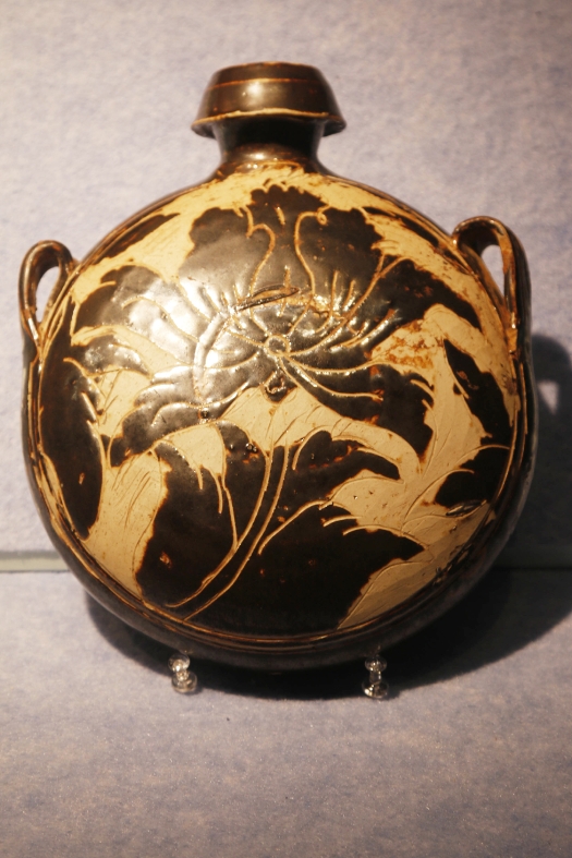 西夏瓷器在色彩和造型上都颇具特色,普遍使用了黑、白、褐釉。“这件褐釉剔刻花瓷扁壶,上面图案其实是牡丹,虽然用的是中原的花卉,但外观又极为独特,它很像现在的军用水壶,“其实在当时是用来盛水、盛酒的,两边有耳,可以拴在马背上,便于在迁移过程中携带使用,符合西夏民族的生活习惯。”
