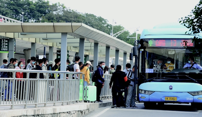 火车站出口处旅客有序排队上车。程曦 摄