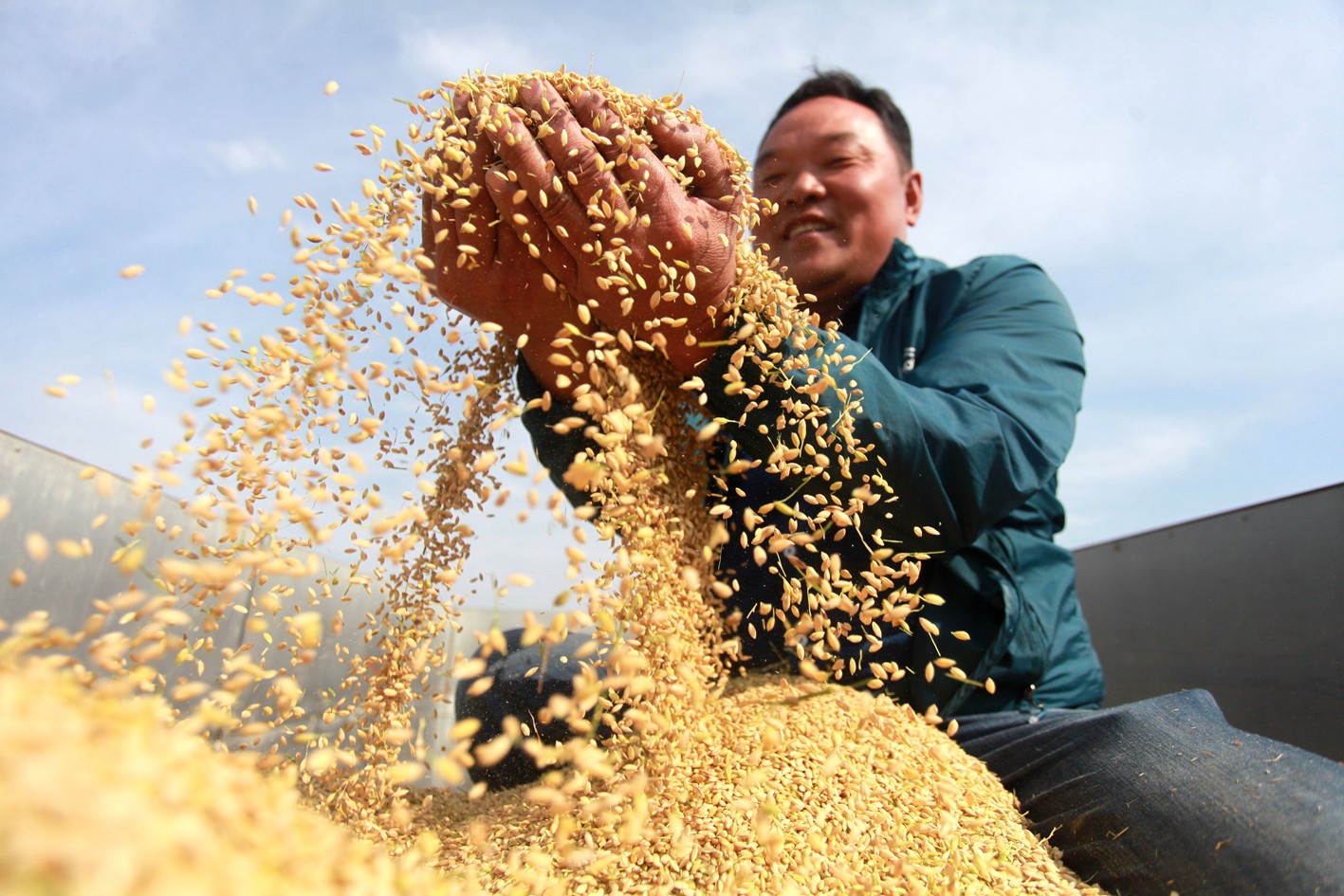 秋收时节,高邮经济开发区钱厦村的水稻陆续成熟,当地农户抢抓时机,利用良好天气收割水稻,喜迎丰收。张旭 李彬彬 孟德龙 摄