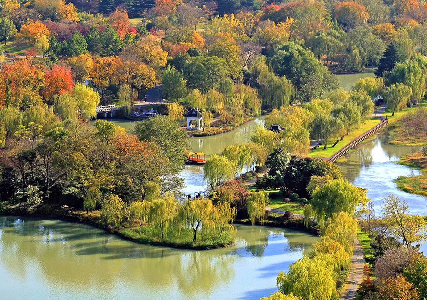 金秋时节,扬州瘦西湖风景区层林尽染、美不胜收,色彩斑斓的树木与湖水相映成趣,构成一幅美丽的秋日画卷,吸引了众多游客市民前来观光游览。
