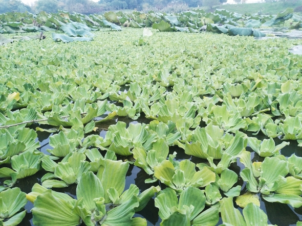 “平山堂路和长春路有两处荷塘,现在荷叶正在枯萎,但水面上长出好多嫩绿色的草,好像叫‘肥猪草’,我感觉这种草不怎么好,因为长得太多了。”昨日,扬州摄影爱好者杭德泉给记者打来电话,称荷塘里长出一种陌生植物,“水面被遮盖得严严实实,钓鱼的人都说,这种植物下面连鱼都没有。”