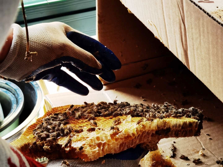 在切割蜂巢过程中,徐德伟左手腕被蜇了3次,蜜蜂在他皮肤上留下白色的尾针。薛德伟疼得直咧嘴:“夏季容易点,我可把蜜蜂先赶出去,现在天气冷了,蜜蜂不太活跃,反而增加了被蜇的风险。”