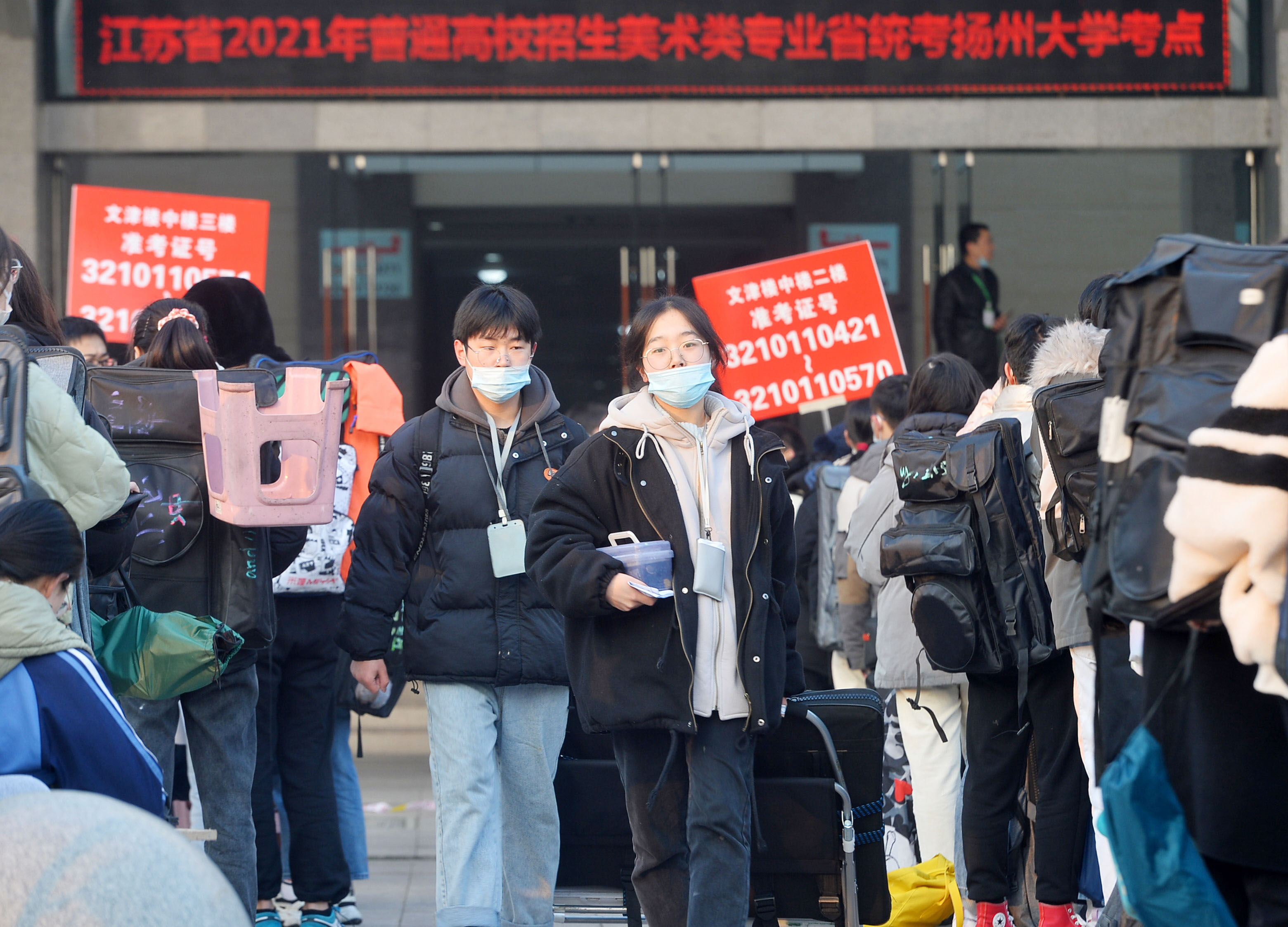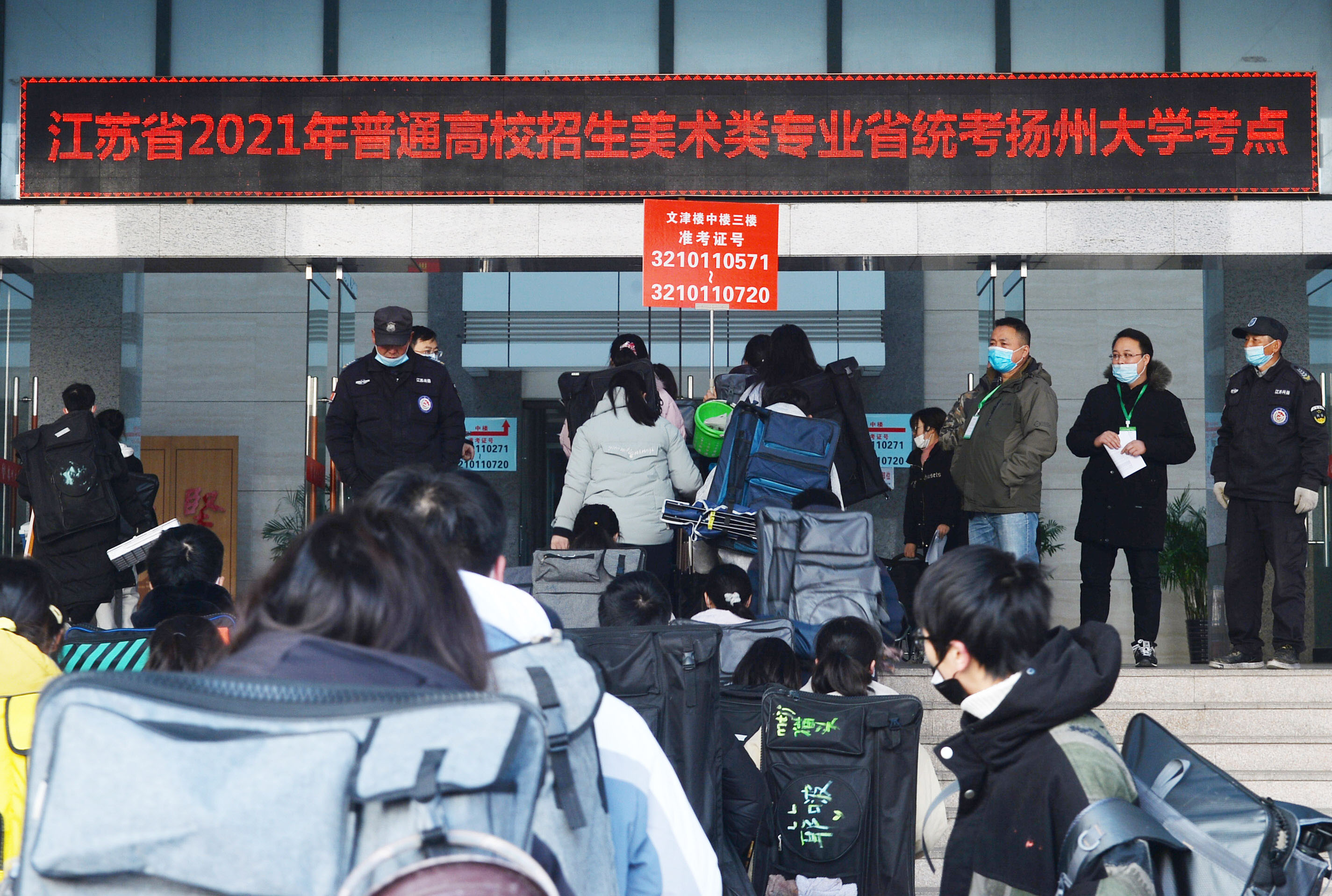昨天下午5:00,江苏省2021年普通高校招生美术类专业统考落下帷幕。全省28000余名考生分别在13个地市考区参加考试。扬州地区900多名美术考生在扬州大学扬子津校区完成考试。按照疫情防控工作要求,只能由考生进入考场,家长与送考教师止步于考点外。