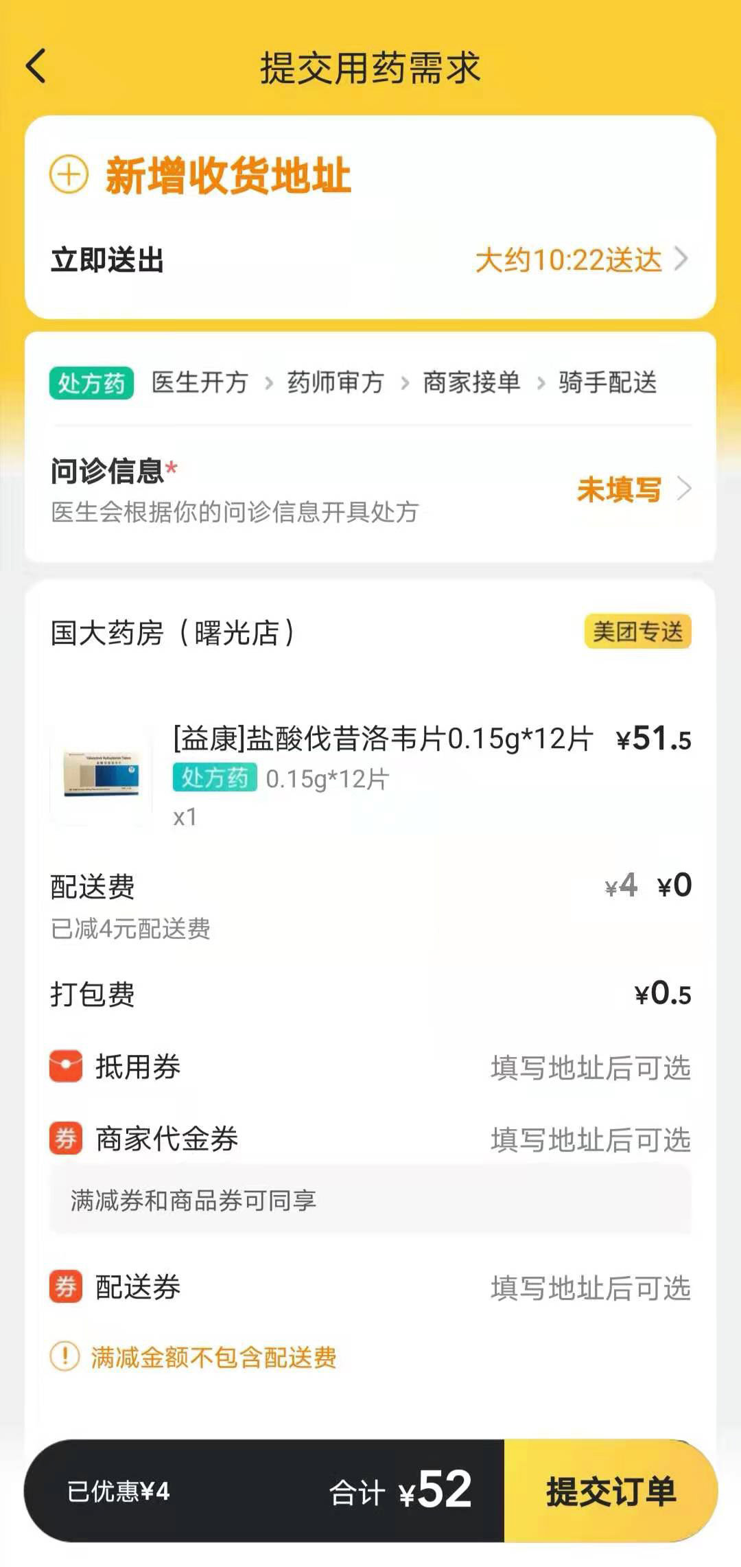 在美团外卖平台,记者选择一款治疗带状疱疹的处方药物,没有咨询就直接到了下单页面,问诊信息显示为“未填写”,记者填写后,仍未显示出相应处方。
