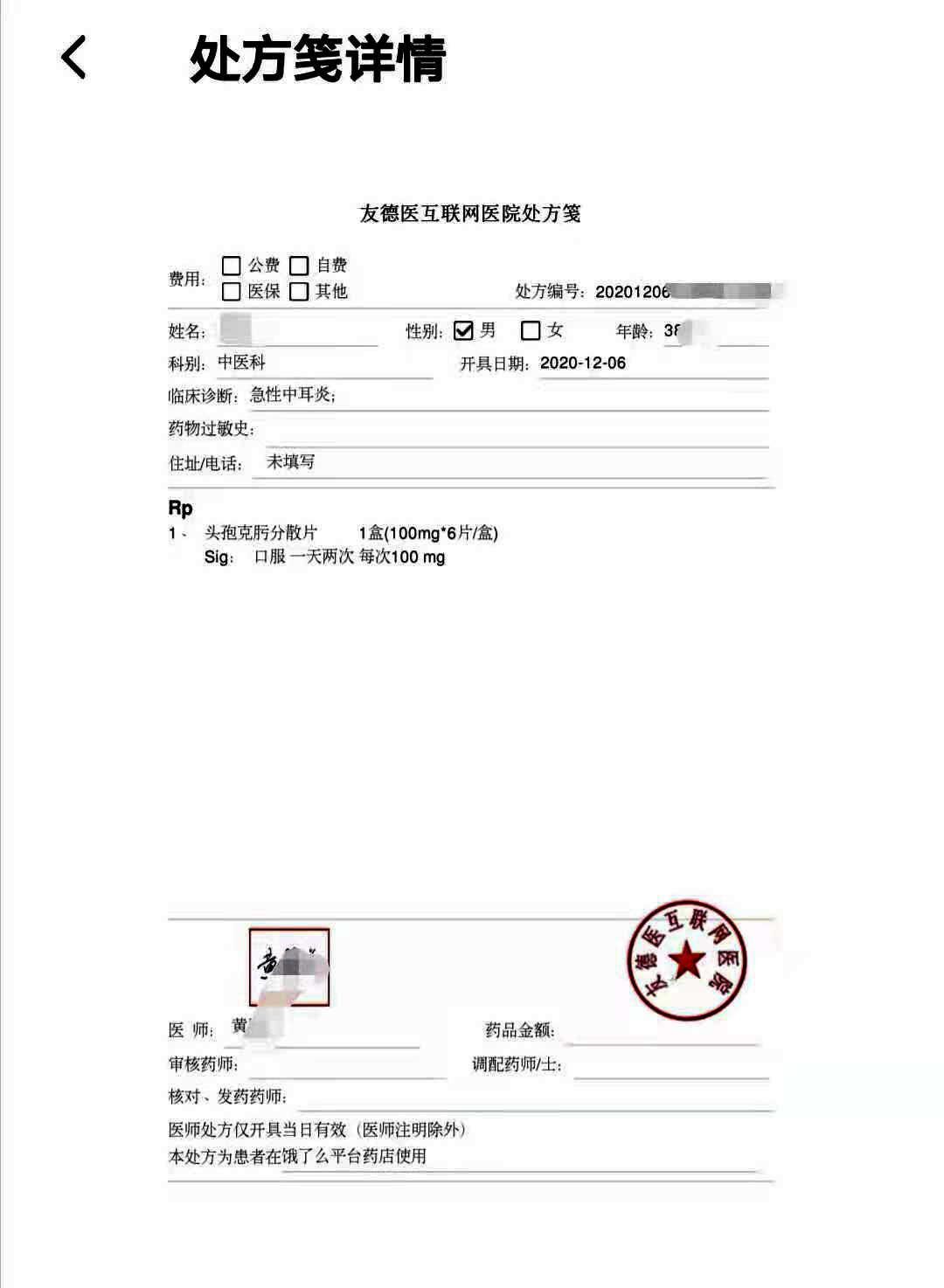 在饿了么外卖平台,记者检索头孢类药物,跳转至就近的药店商家,每一家都有相应的起送费和配送费标注。记者选择一家咨询头孢克圬分散片,对话栏中弹出一个咨询:“您本次用药已确诊的疾病是什么?”记者输入耳道发炎,一个处方笺就弹了出来,诊断写着:急性中耳炎。