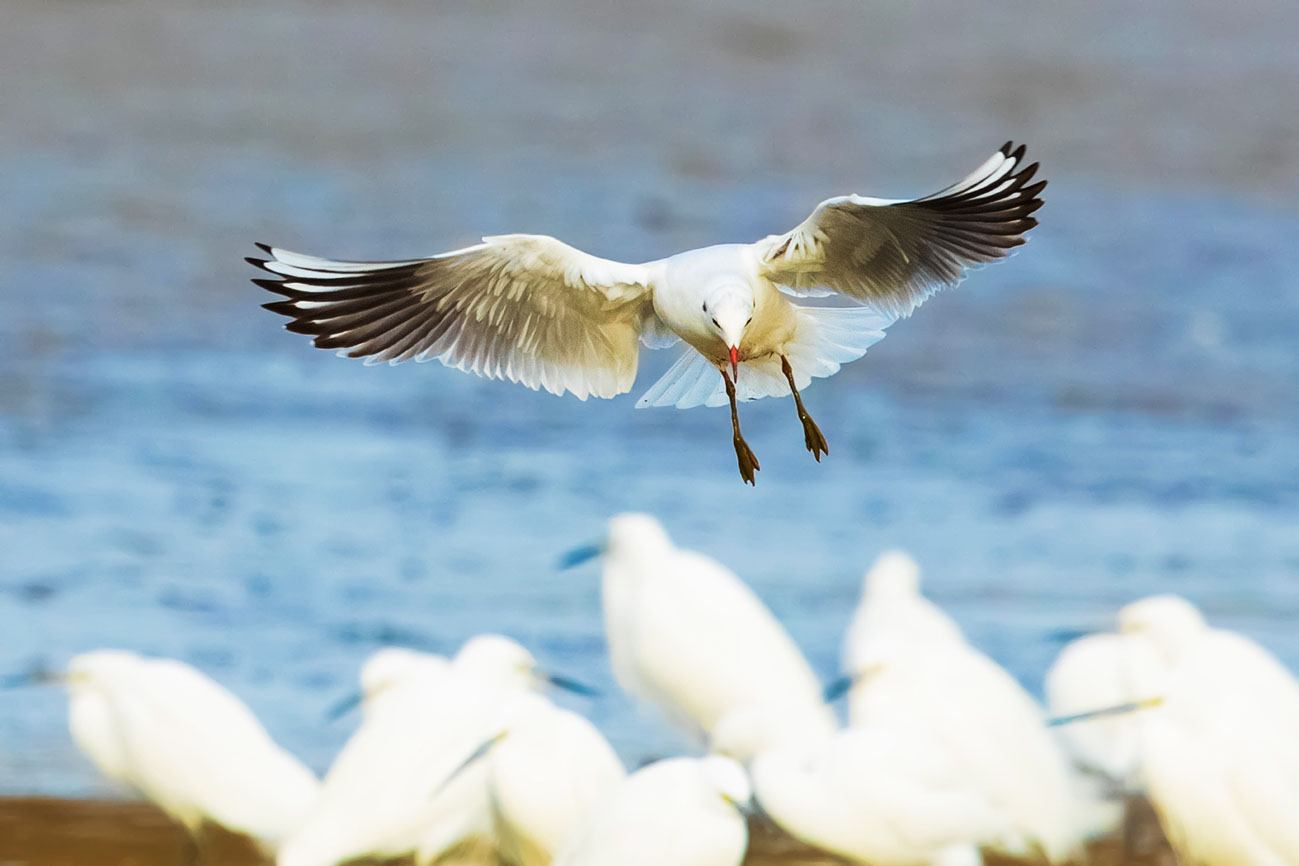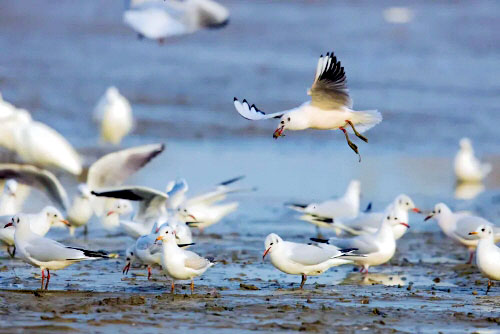 当一群红嘴鸟儿出现在高邮湖时,意味着候鸟迁徙已进入尾声。这些红嘴鸟儿正是红嘴鸥。通常,它们是最后抵达扬州的冬候鸟。