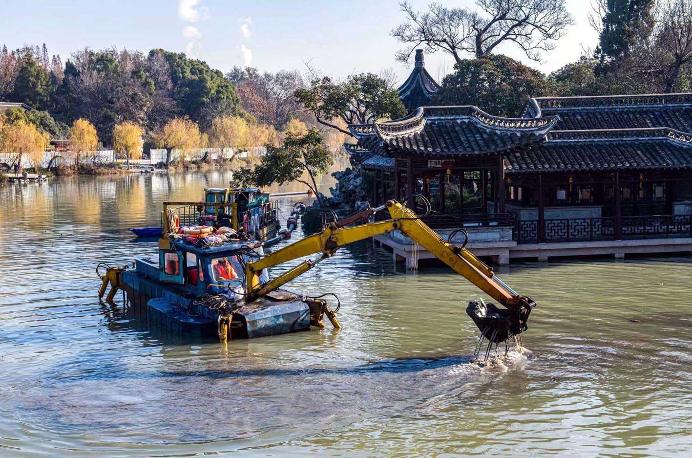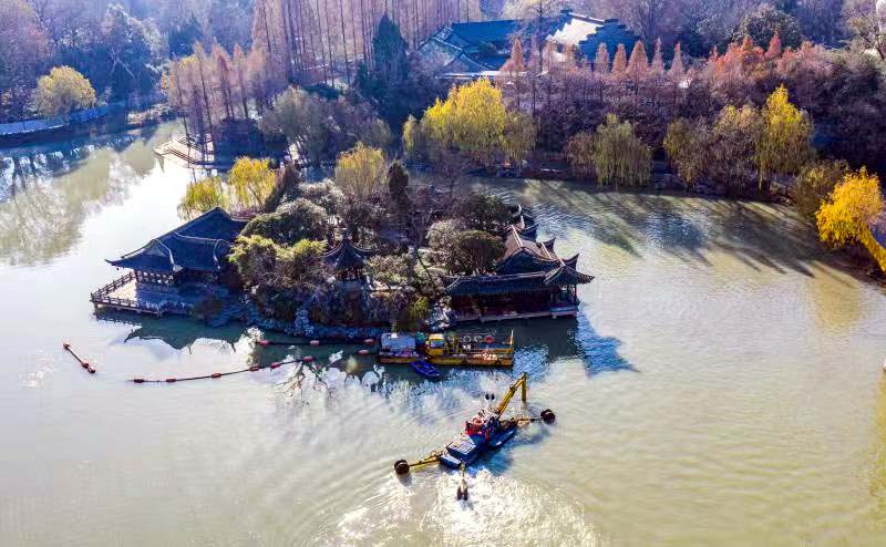 扬州网讯 (记者 刘江瑞) 20日上午,在瘦西湖五亭桥东边的湖面上,清淤疏浚工作正在有序进行。从12月11日起,瘦西湖对湖区进行全面清淤疏浚,工程实施期间,瘦西湖门票价格优惠至30元/人。据悉,本次施工水域面积约32万平方米,同时还将对沿岸护坡和景观进行全面提升改造。春节前,瘦西湖景区核心水域完工,全部工程则在明年4月完成。届时,瘦西湖将以“一湖清水”迎接海内外游人。