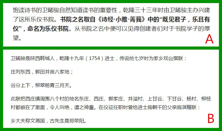 《仪征古迹之涉园、乐仪书院》全文共有8566字,是巫晨准备出版的《探访仪征》(暂定名)真州部分的一篇,文章介绍了多处古迹,最后一个部分介绍了乐仪书院。头条号上的这篇文章则单独介绍了乐仪书院,只是文章段落和表述方式不同,巫晨表示,感觉像是把自己的文章“经过了浓缩,取其精华”。