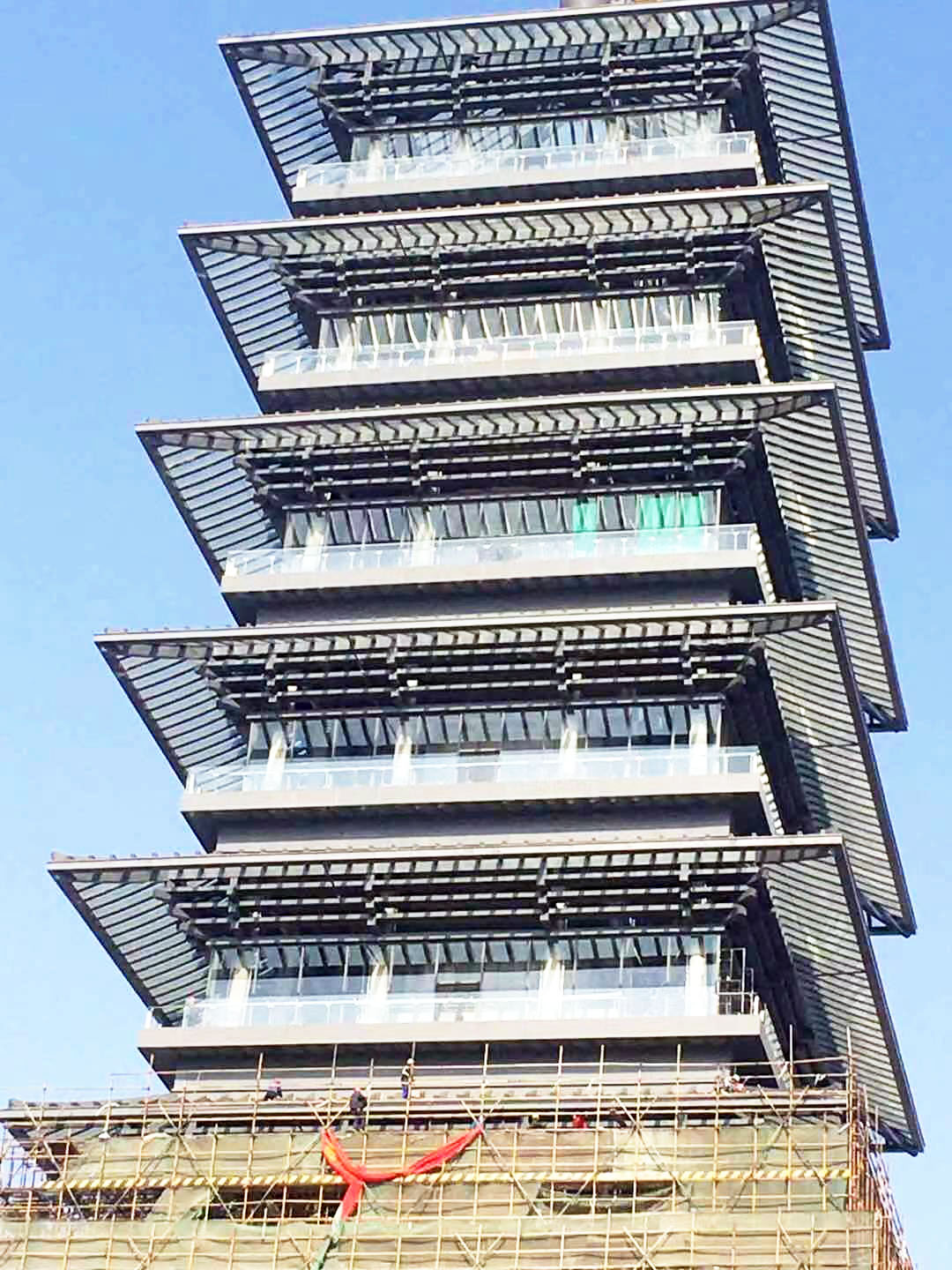 大运塔地下1层,地上明层9层,同时有两个暗层。大运塔塔刹于去年10月完成吊装,塔刹高10多米,将大运塔高度提升到112.3米。施工单位江苏邗建集团项目经理薛庆兵介绍,大运塔脚手架计划下月初全部拆完,塔身全部展现,塔的内部装饰也已启动,计划今年“4·18”完成。