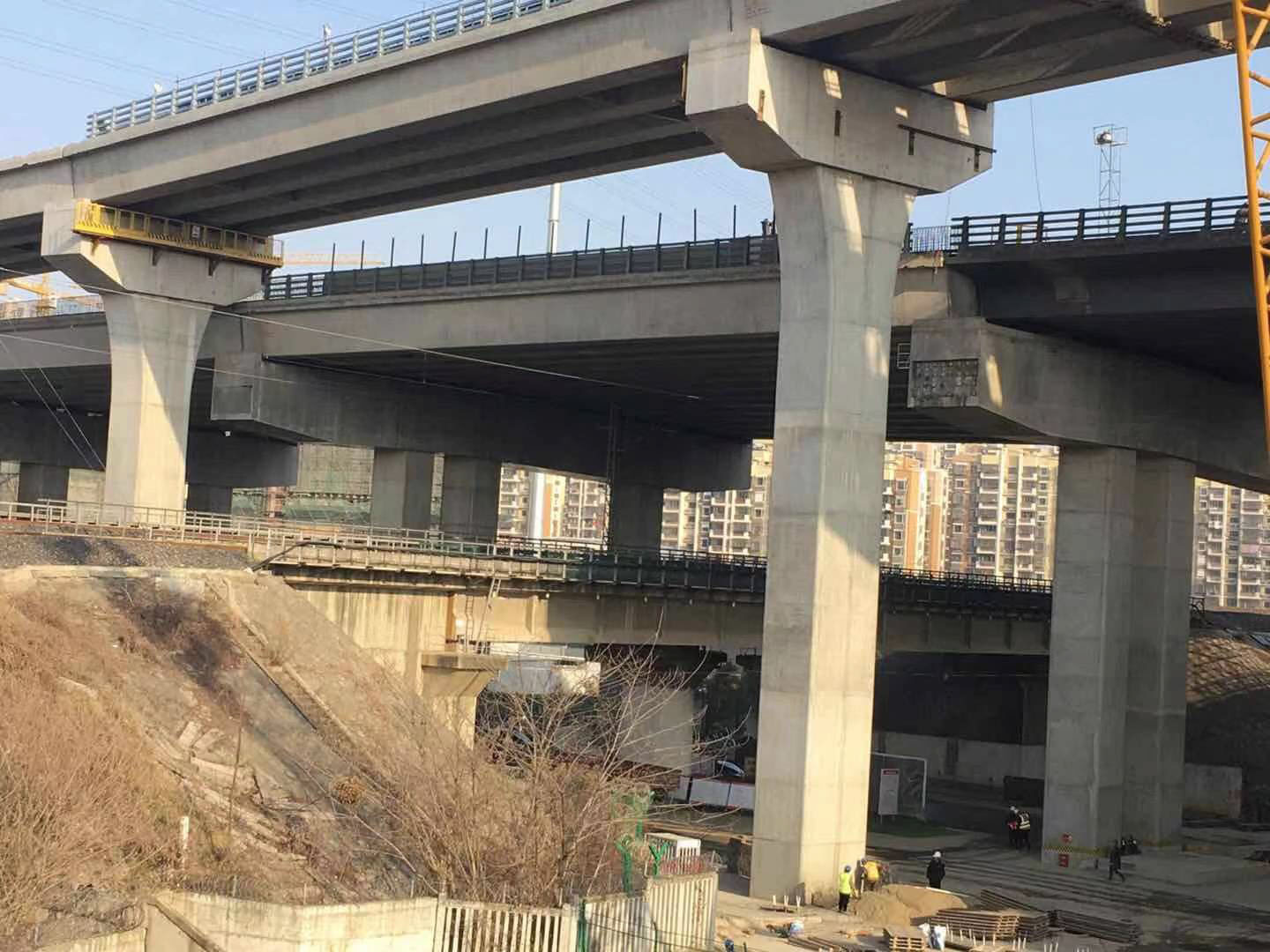 第一层为南北向的润扬北路地面,这一层由于受此前高架箱梁吊装影响无法施工,如今吊装已经结束,开始了路面施工,正在进行的是管道埋设,计划春节期间完成路床施工,铺设水稳。