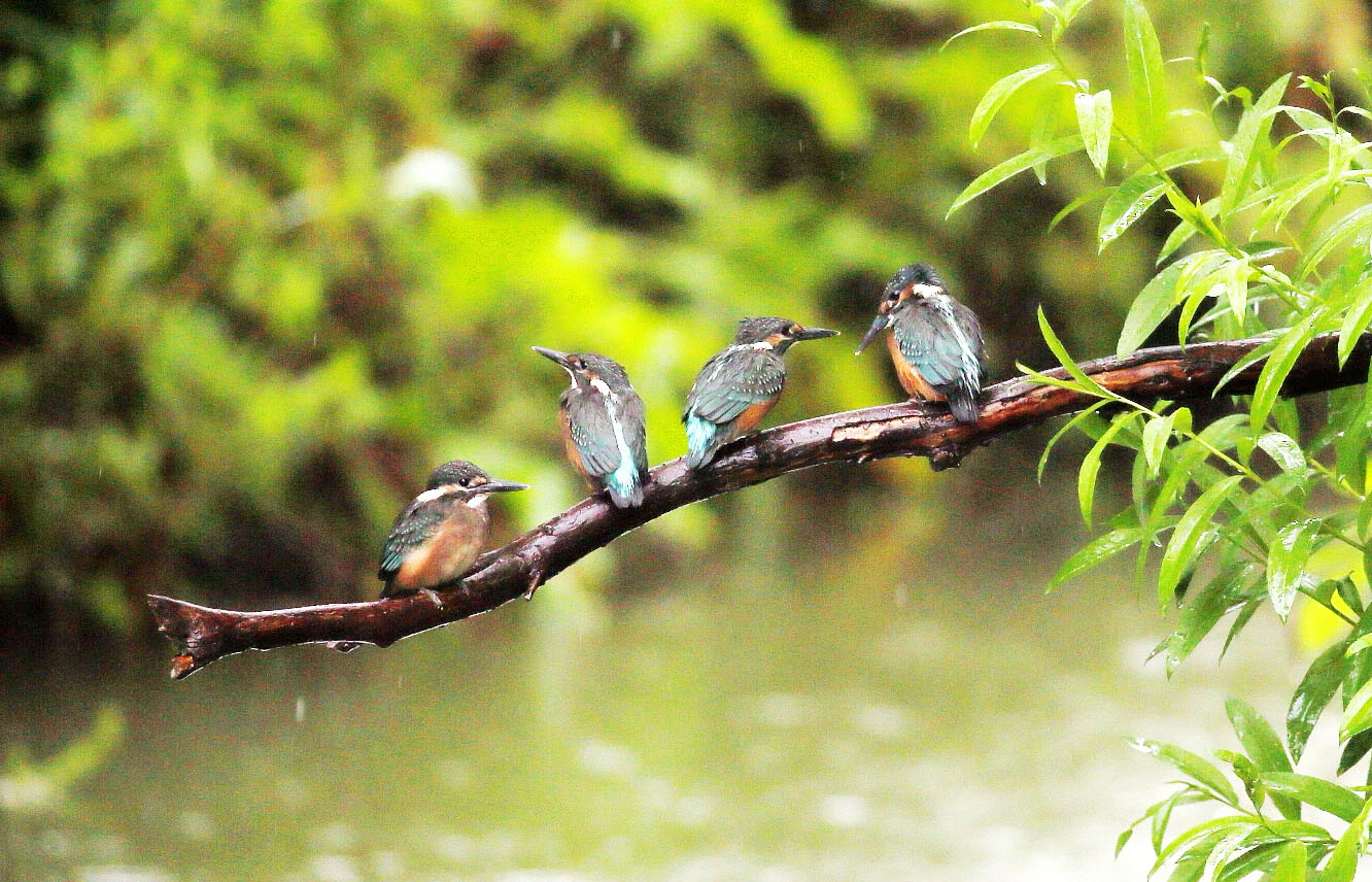 在堡城池塘的一对翠鸟夫妇精心哺育下,翠鸟宝宝们已经长大。前天尽管下起大雨,但翠鸟宝宝一齐飞出洞外,齐刷刷挤在一起,等待爸爸妈妈送来美餐,这种场景极其少见。堡城周边生态优良,该池塘已成为翠鸟繁殖基地,每年都有许多小翠鸟诞生。     蒋永庆 摄