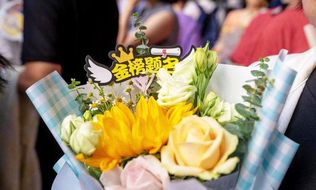 高考结束,家长手捧鲜花迎接走出考场的孩子 陆曙 摄