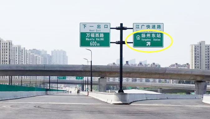 近日,网友“吉蒙蒙”通过扬州发布手机APP报料平台反映,即将通车的江广快速路上的江运互通处,有一块路牌上高铁“扬州东站”的英文翻译错了,火车标志画得也不标准。