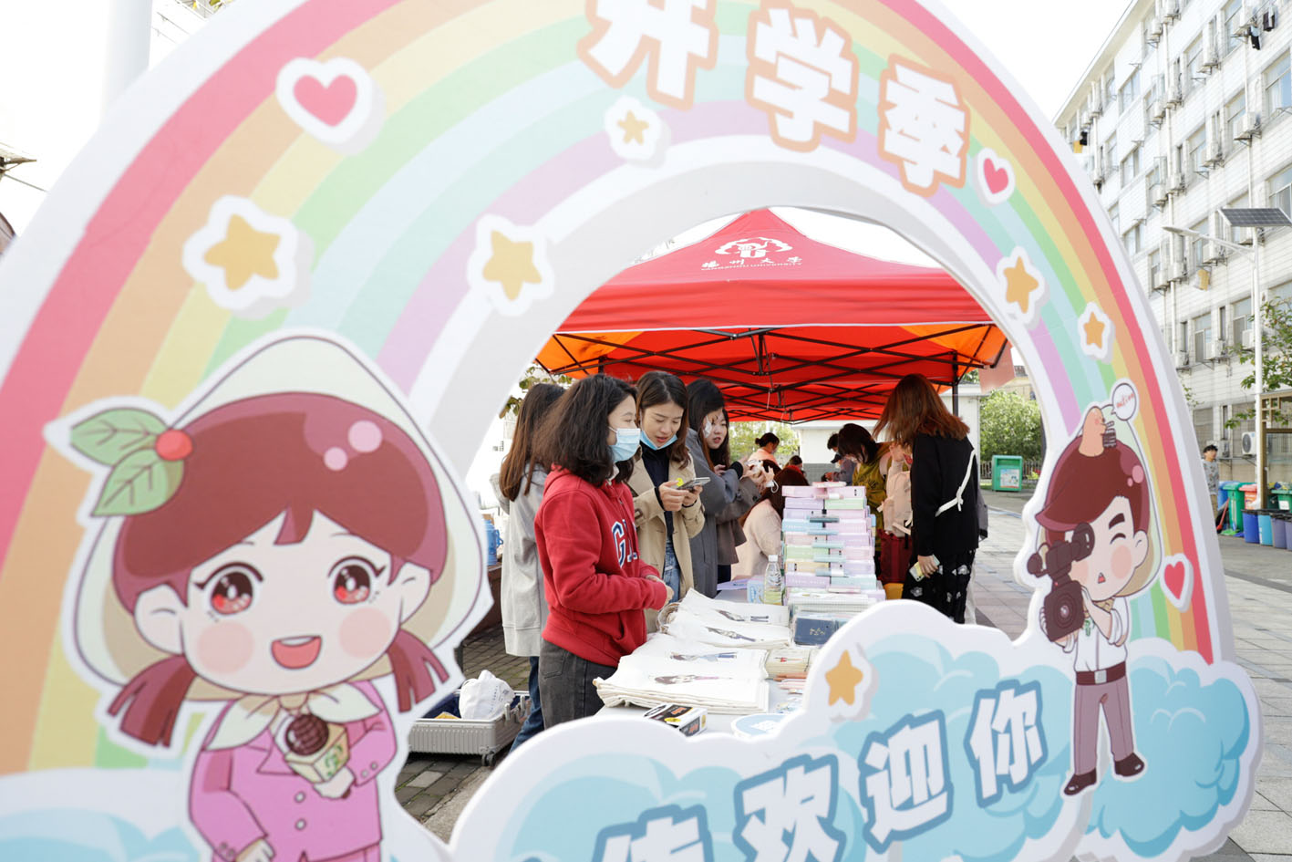 办理入学手续的时候,大家感受到了别样的惊喜。在道路一侧竖着一块大展板,上面用所有新生的照片组成了星星图案,在这里,可以拍摄与学院的第一张合影。