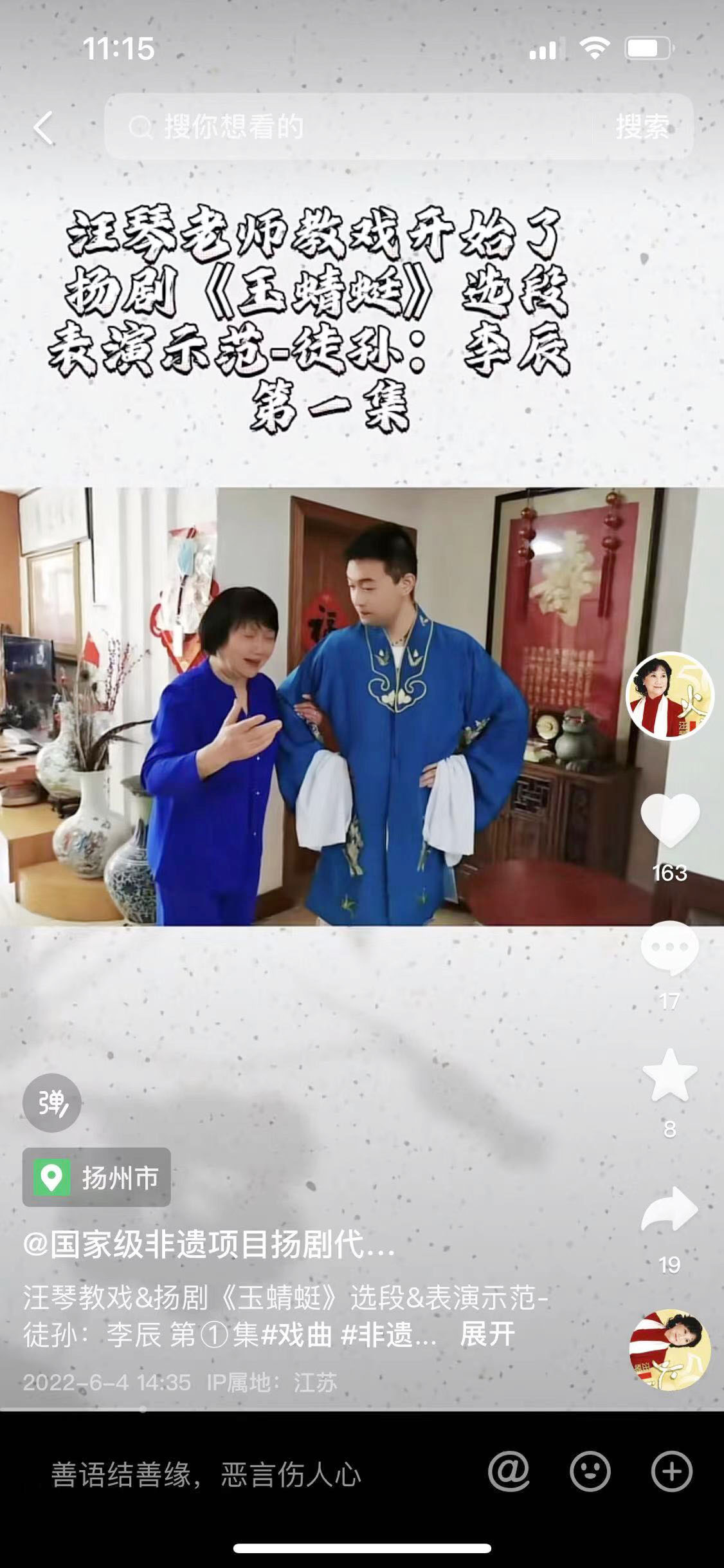 汪琴的抖音号名字叫“国家级非遗项目扬剧代表性传承人汪琴”,有1.2万粉丝,5.6万获赞,62件作品。今年,她已经84岁了。