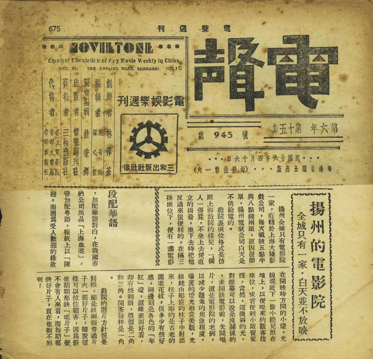 史料展还展出了一张1937年4月16日的《电声》报纸,其中记录了扬州电影院当时的经营状况。同时,民国唯一的扬州电影院——南京大戏院照片实物也首次亮相,由南京大戏院当年的员工王炳坤的儿子王立提供。该戏院每天只有在下午5点30分、晚上8点两个时间段放映电影。“原因很简单,扬州电气公司白天是不供给电的。”报道中记载。