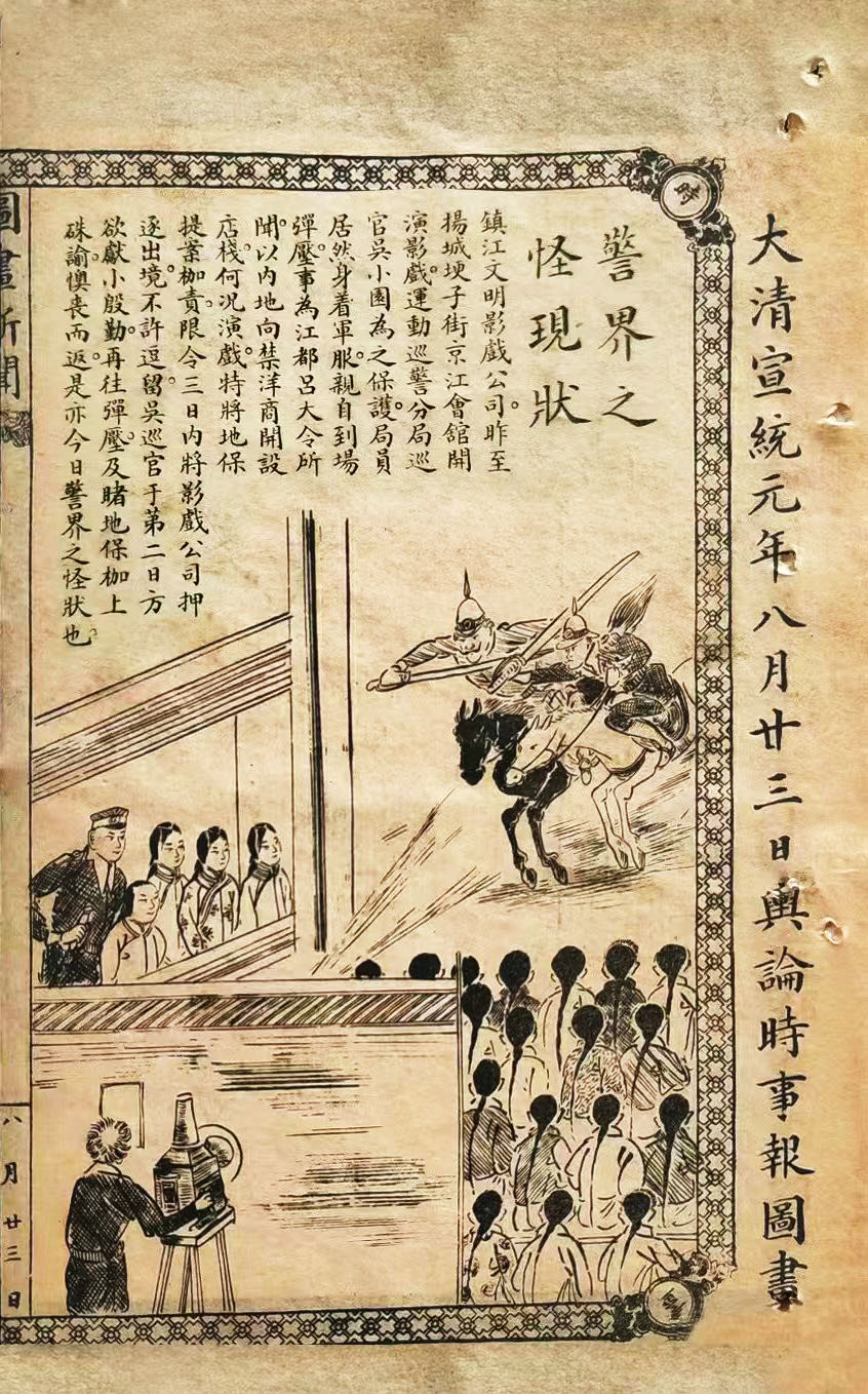 在仁丰里扬州老照片馆,记者看到,展陈的第一件实物,就是1909年8月23日的《舆论时事报》。报纸用整版漫画刊登了百余年前扬州老百姓接触电影放映的场景。报纸上记载,1909年8月22日镇江文明影戏公司至扬城埂子街京江会馆开演影戏运动(即放映电影),巡官居然到场弹压,并责限(电影公司)三日内出境。漫画中,画有放映员放映电影、百姓围坐而观、巡官骑马驱逐等场景,生动清晰,此事被报纸称为“怪现状”。