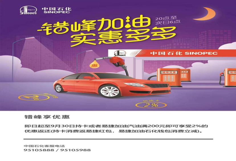 中国石化扬州石油分公司在全区9座加油站(仪征浦东、江都扬帆、江都立交桥、高邮屏淮、广陵石塔、广陵新民、广陵五台、广陵连运、宝应城东)开展错峰加油优惠活动。活动内容为每天20:00-次日06:00持卡或者易捷加油汽油满200元即可享受2%的优惠返还(持卡返易捷红包,易捷加油石化钱包消费立减)。
