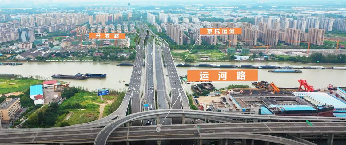 工程采用“主六辅六”的高架式快速路形式,西起点顺接运河快速路互通,主线在现状京杭大桥两侧分幅通过,在京杭南路东侧合并为整体式高架向东延伸。高架桥桥墩布设在地面道路南侧侧分带内,连续跨越秦邮路、明发路。工程以明发路为界,分以西一标段和以东二标段两个标段建设,整个工程计划明年完工。
