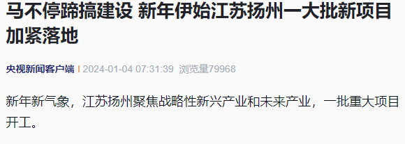 1月4日,央视《朝闻天下》以《马不停蹄搞建设 新年伊始江苏扬州一大批新项目加紧落地》为题,关注扬州新兴产业和未来产业项目落地。扬州发布现全文转发,以飨读者。