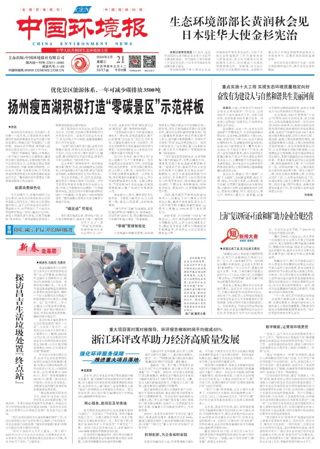 2月21日出版的《中国环境报》,头版头条以《扬州瘦西湖积极打造“零碳景区”示范样板》为题,聚焦我市瘦西湖优化景区能源体系、打造“零碳景区”的绿色先进做法。
