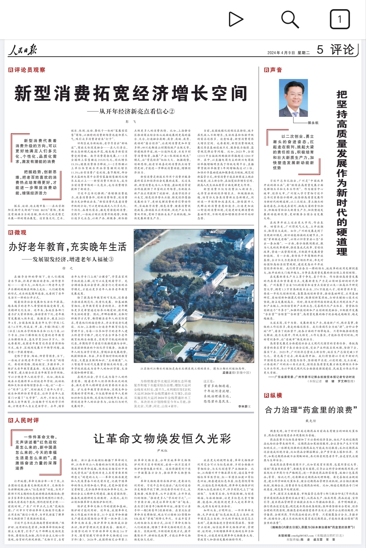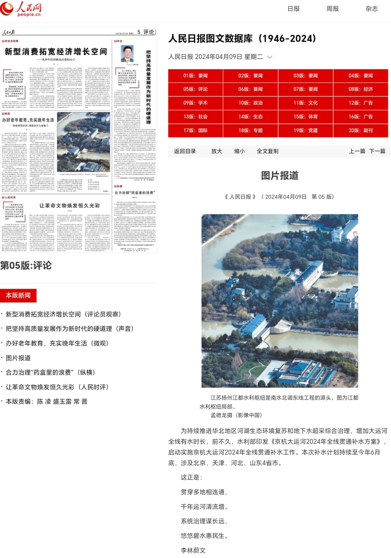 4月9日出版的《人民日报》在第05版刊发由扬州报业传媒集团摄影记者孟德龙航拍的江都水利枢纽的照片。江都水利枢纽是南水北调东线工程的源头。