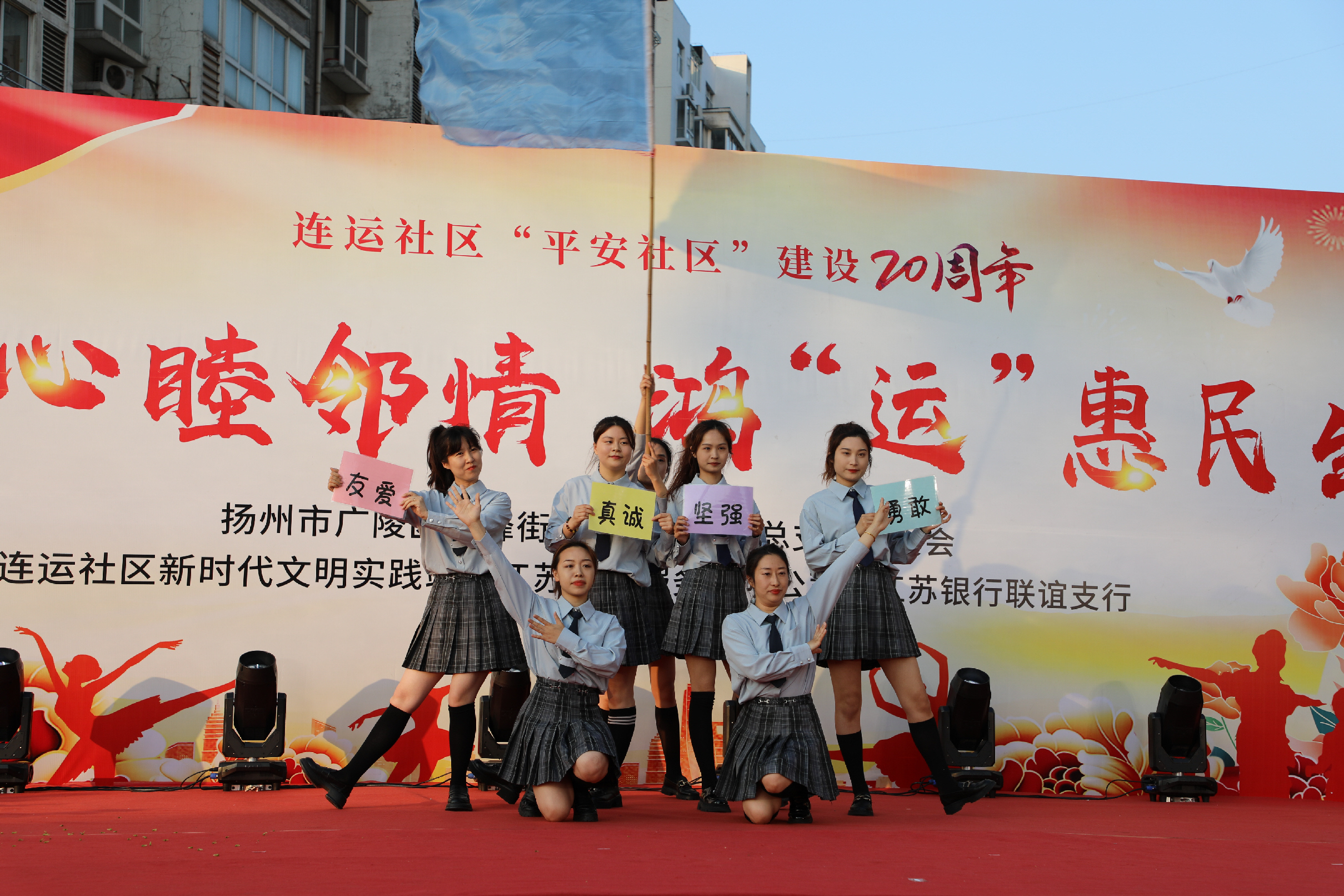 4月26日下午,广陵区文峰街道连运社区举行“平安社区”建设20周年——“连”心睦邻情、鸿“运”惠民生庆祝活动。图为表演者们展示真诚、坚强、勇敢、友爱的宣传标识。