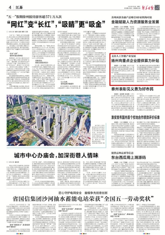 5月8日,《新华日报》刊发报道《扬州向重点企业提供算力补贴》。现全文转发,以飨读者。