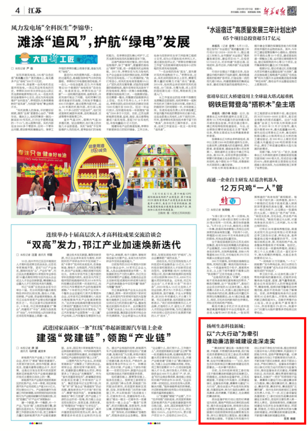 5月13日,《新华日报》刊发报道《扬州生态科技新城:以“六大行动”为牵引推动廉洁新城建设走深走实》。现全文转发,以飨读者。