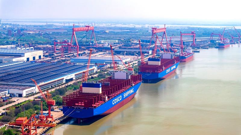 扬州中远海运重工全力推进生产建造任务:4月8日,完成一艘14100TEU集装箱船出坞、一艘16180TEU集装箱船开工和一艘21.1万吨散货船开工等重要生产节点;4月24日,一艘8.25万吨散货船和一艘8.2万吨散货船顺利出坞进入水下舾装阶段;4月26日,一艘8.2万吨散货船在舾装码头正式命名,同日两艘8.25万吨散货船进坞全面开启搭载工作,再次达成同日多节点。新大洋造船通过技术改造正以每月两艘的速度交付新船……
