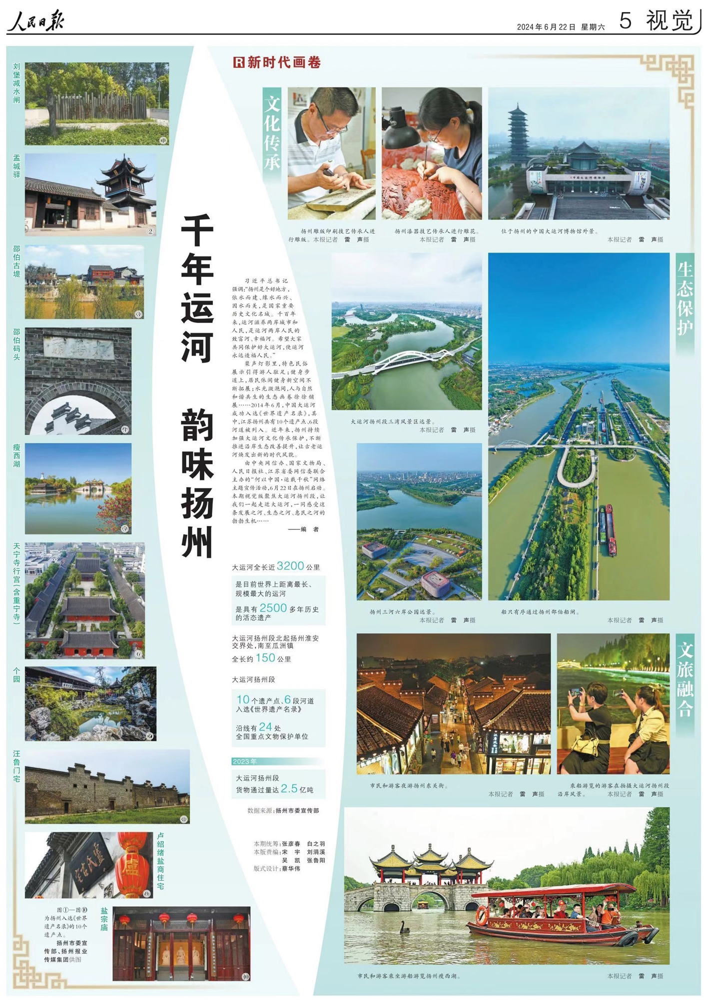6月22日,《人民日报》用整版篇幅推出《千年运河 韵味扬州》视觉专题。扬州市委宣传部、扬州报业传媒集团供图,并协助人民日报记者在扬州进行采访拍摄。