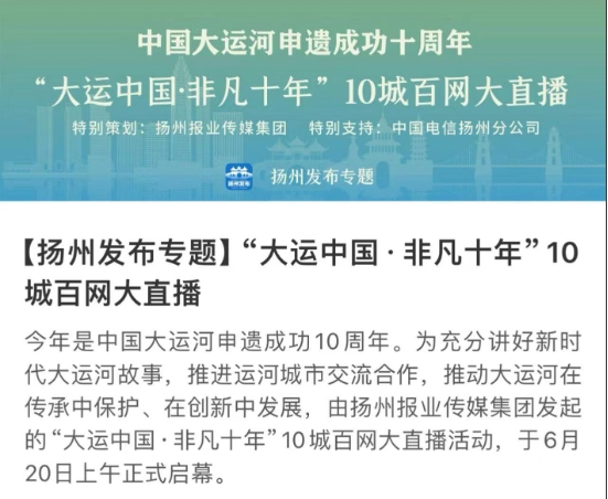 扬州报业传媒集团联合大运河沿线重要节点城市,发起“大运中国 非凡十年”10城百网大直播。