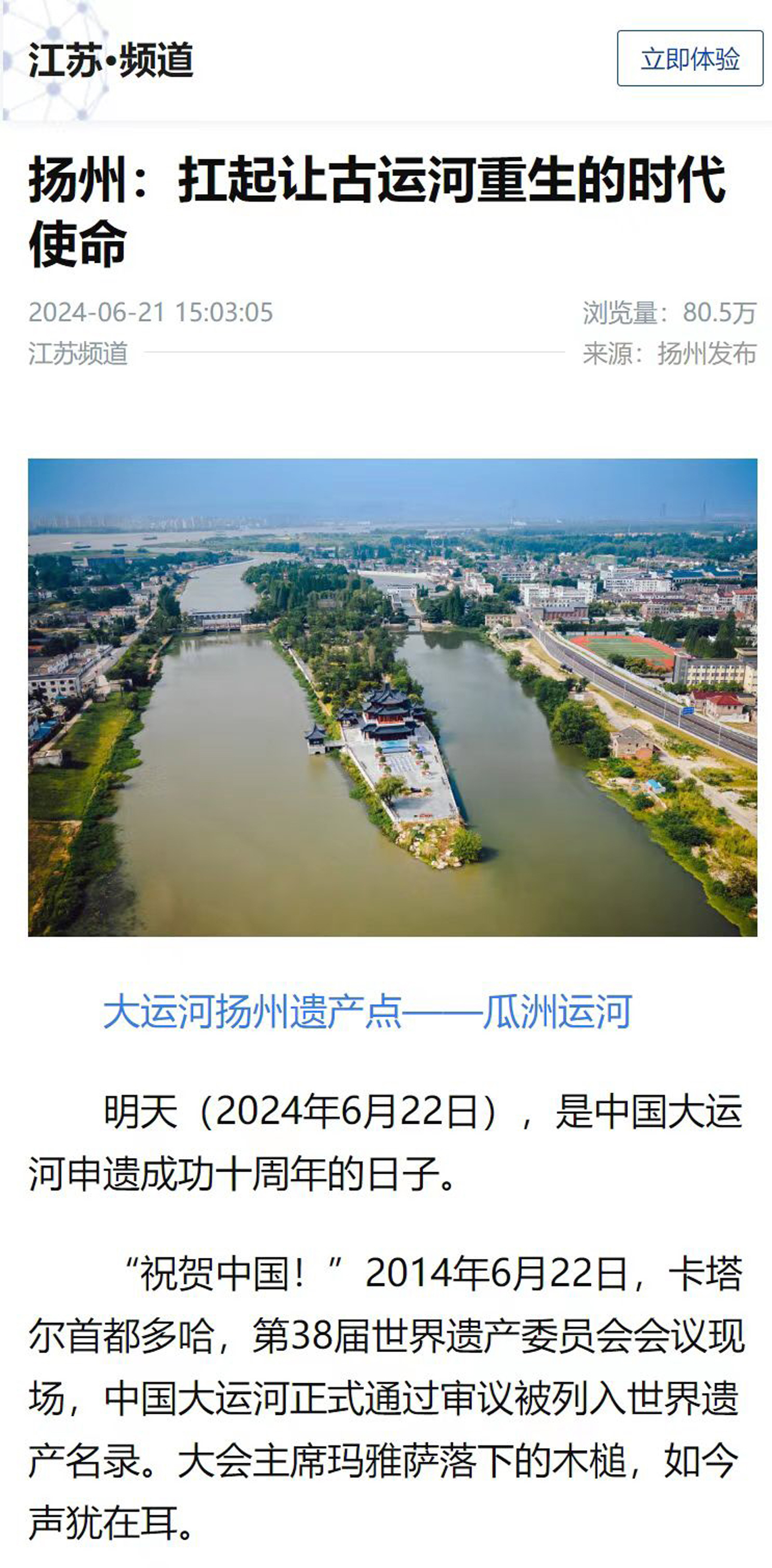 十年前的6月22日,卡塔尔首都多哈,第38届世界遗产委员会会议上,中国大运河正式被列入世界遗产名录。扬州是中国大运河申遗牵头城市。22日晚,中央网信办、国家文物局、人民日报社、江苏省委网信委等联合主办的“何以中国 运载千秋”网络主题宣传活动在扬州启动。人民日报、新华社、央视、人民网、新华网等众多央媒省媒聚焦此次活动,聚焦“运河长子”城市——扬州,各大主流媒体发稿百余篇。#何以中国 运载千秋#、#看扬州#、#爱上扬州#等话题冲上热搜。微博、抖音、小红书、今日头条、快手、哔哩哔哩等社交APP浏览量均以亿计。截至23日中午12时,与扬州相关报道和话题的全网浏览量近50亿次。