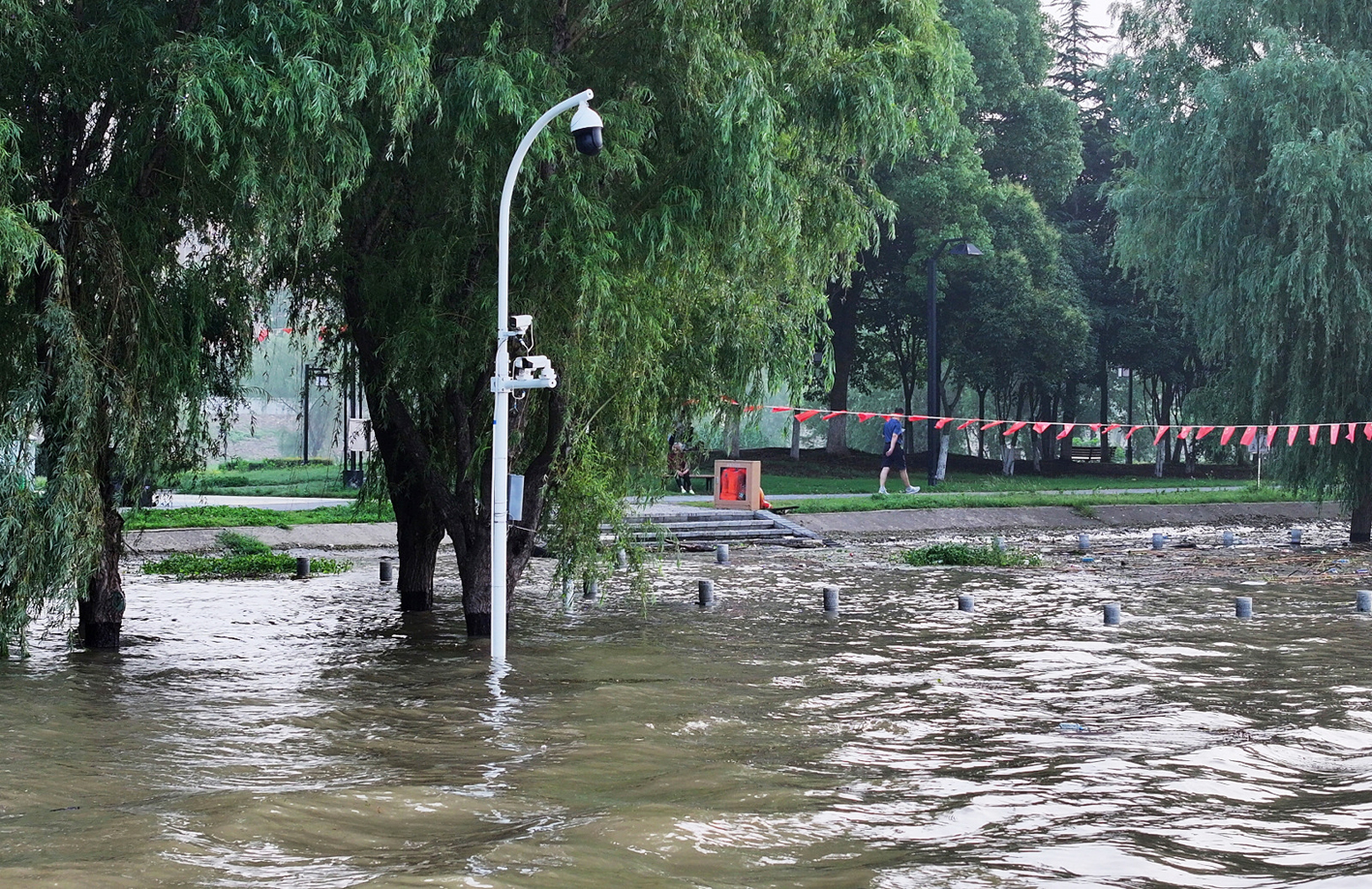 7月1日,受持续降雨和上游来水影响,长江仪征段水位出现明显上涨。图为被江水淹没的仪征市扬子江公园一角。 孟德龙 摄