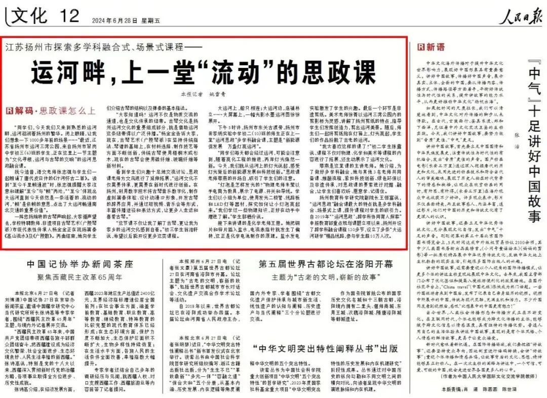 6月28日,《人民日报》在文化版头条位置,以《运河畔,上一堂“流动”的思政课(解码·思政课怎么上)》为题,关注扬州探索多学科融合式、场景式“运河思政”课程的相关举措。扬州发布现全文转发,以飨读者。